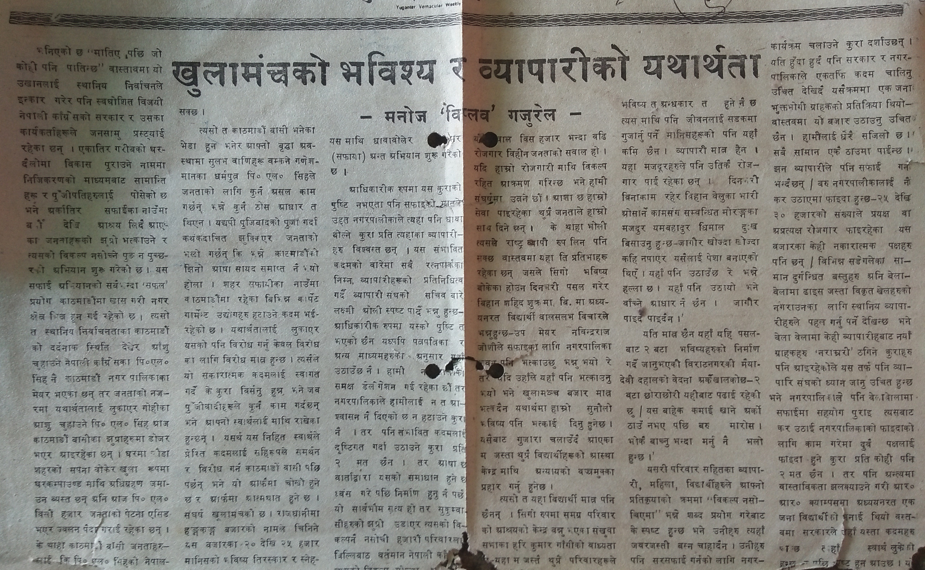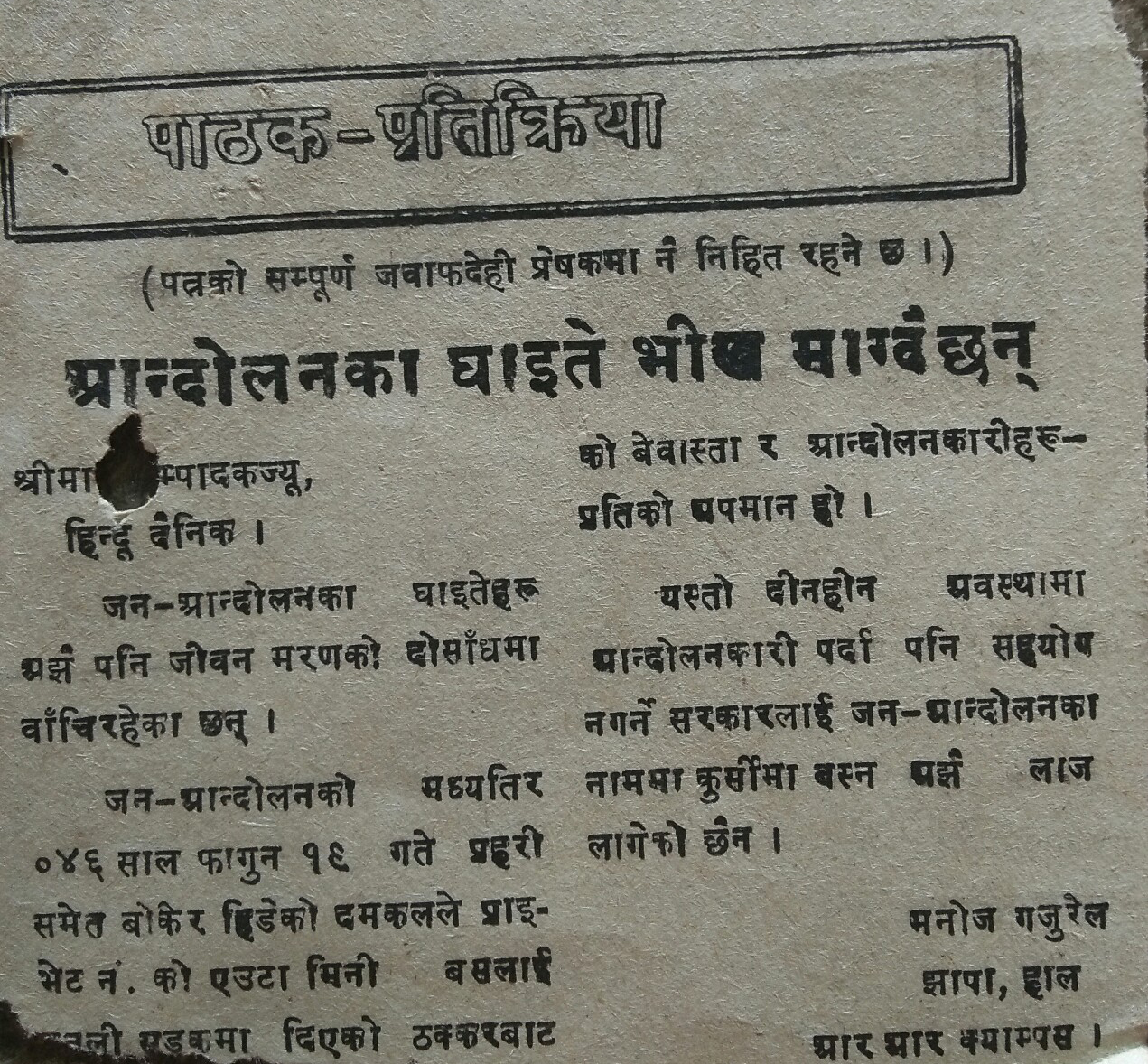 ‘२०४८ सालको कुरा हो । ‘युगान्तर साप्ताहिक’ नामको पत्रिका चल्दथ्यो । प्रेम कैदी सम्पादक थिए भने गिरिश पोखरेल संवाददाता । सोही पत्रिकामा मायानाथ गजुरेलको नाममा ‘सम्पादकलाई चिठ्ठी’ प्रकाशित भएको थियो ।
