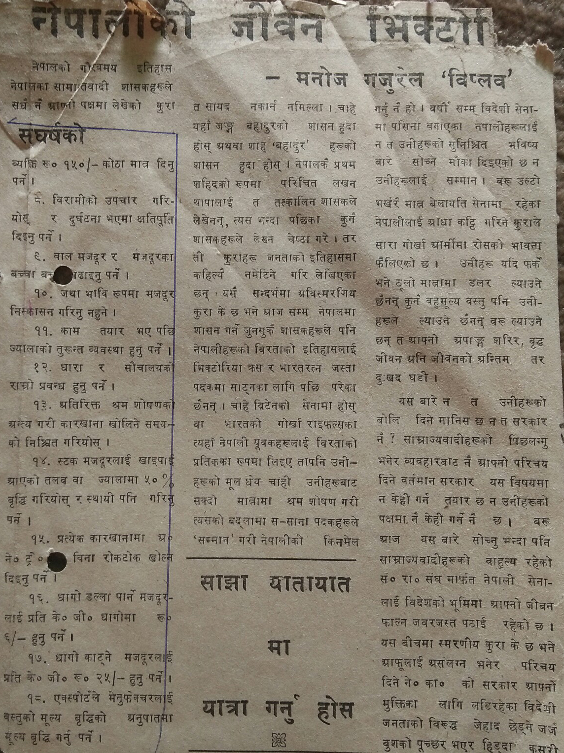 २,४ अंकपछि फेरी भने– ‘मनोजपनि कमन नाम भयो, एउटा टाईटल राख ।’ कुरो मन पऱ्यो तर टाईटल के राख्ने होला † कतै सुन्या थिएँ– जीवनमा एकपटक जो पनि क्रान्तीकारी हुन्छ रे ! मैले पनि त्यही दिन आफ्नो नामको पछाडी क्रान्तीकारी उपनाम झुण्ड्याएँ– मनोज ‘विप्लव’ गजुरेल ‘विप्लव’ !