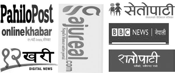 यस शिर्षकमा प्रकासित ‘हेडलाईन’हरु बिभिन्न अनलाईनबाट साभार गरिएका हुन् । अनलाईन खबर, ननलाईन खबर, रातोपाटी, सेतोपाटी, बाह्रखरी, तेह्रथरी, बिबिसि, सिबिसि, पहिलोपोष्ट, दोश्रोपोष्ट, अन्नपुर्ण पोष्ट, माछापुच्छ्रे होस्ट, नयाँ पत्रिका, पुरानो कागज, माई संसार डटकम, योर संसार चट्कम लगायत ज्ञात/अज्ञात ‘हेडलाईन श्रोत’हरुलाई धन्यवाद सहित Thank You Very Much.