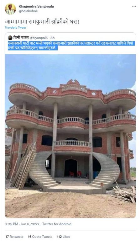 उनि लेख्छन- ‘यो घर भारतदेखी केन्या, उज्वेकिस्तान, मोरक्को, इरानबाट सञ्चालति वेबसाइटहरुमा पनि भेटियो । गुगल सर्च गर्ने क्रममा हामीले सामाजकि सञ्जालमा भाइरल भएकै हुबहु फोटो थुप्रै वेबसाइटहरुमा पनि भेट्यौं । बिभिन्न देशका हाउजिङ्ग कम्पनीहरुले यो फोटो आफ्नो प्रमोसनकालागी प्रयोग गरेको हुनसक्छ । तसर्थ यो घर मन्त्री झाँक्रीको भनी गरएिको दावी मिथ्या भएको देखिन्छ ।’